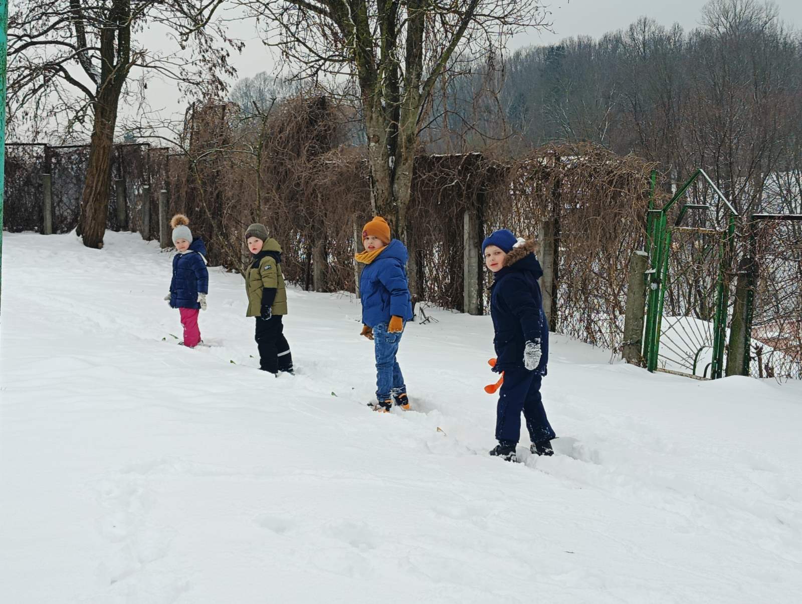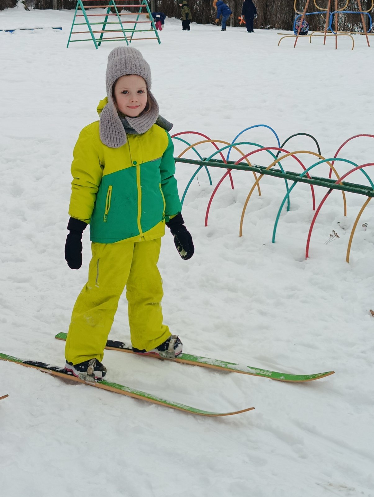 У нашай дашкольнай установе знаёмства з лыжамі праходзіць на занятках фізічнай культурай. Заняткі праходзяць на свежым паветры. Дзякуючы гэтаму арганізм насычаецца свежым марозным паветрам, дашкаляты поўныя энергіі. Для пачатку юныя лыжнікі проста вучацца хадзіць па лыжні, напераменку рухаючы лыжы, але не адрываючы іх ад зямлі. Аказваецца, нават гэта не так проста, хлопчыкі і дзяўчынкі праяўляюць вытрымку і цярпенне, а педагогі стараюцца ўсімі магчымымі сродкамі падтрымаць юных спартсменаў. На пачатковых этапах знаёмства з лыжамі няма ніякай неабходнасці ў лыжных палках. Без іх юныя спартсмены хутчэй навучаюцца трымаць раўнавагу і змогуць лепш сканцэтравацца на тэхніцы слізгацення.